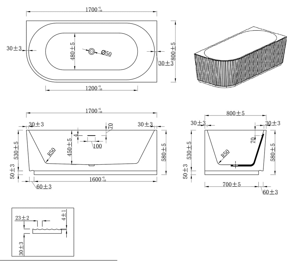 Rivi hoekbad rechts 170 x 80 cm acryl glans wit met waste glans wit