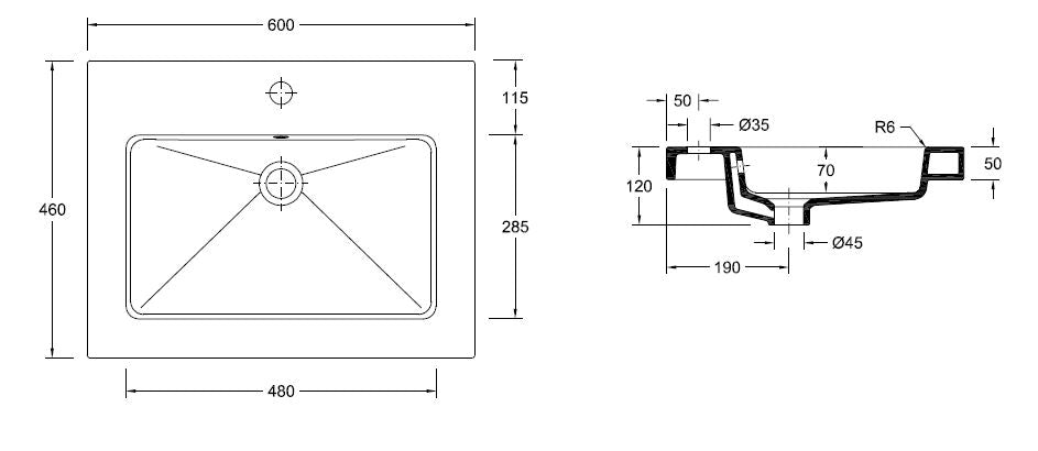 Kera lavabo simple avec 1 trou de robinetterie 60x46x5 cm céramique blanc brillant